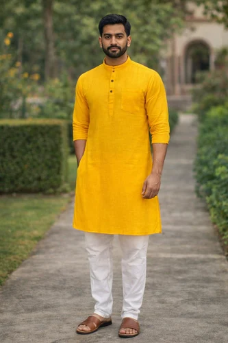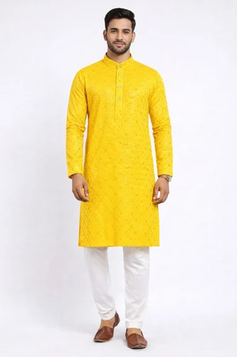Add elegance and festive charm to your ethnic collection with this stylish Yellow Sequin Kurta Pajama Set for Men. Crafted with premium quality fabric, the kurta features attractive sequin work with a subtle textured pattern, giving it a rich and festive appearance. The bright yellow color makes it perfect for special occasions such as weddings, haldi ceremonies, festivals, parties, and traditional events.